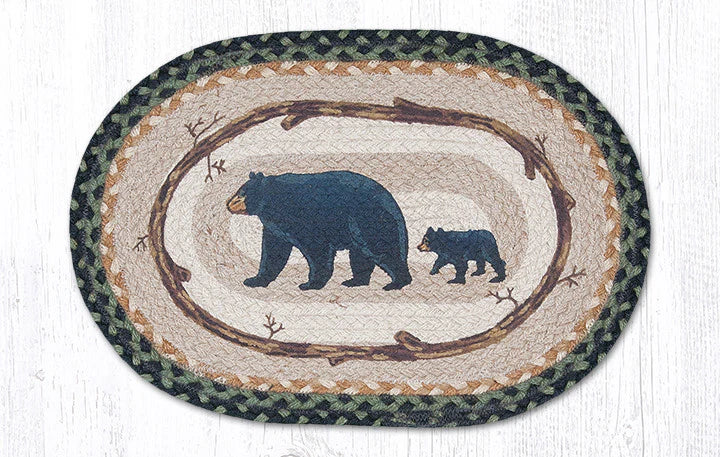 Crafted from 100% natural jute, this hand-stenciled oval placemat measures 13"x19" and features an original Mama & Baby Bear design by artist Jan Harless. Its blend of green, charcoal, and natural tones offers a rustic yet refined look, perfect for protecting your table while enhancing your dining décor. Sold in a set of 4 each placemat showcases expert craftsmanship and durable natural fibers, making it a stylish and sustainable addition to your home.