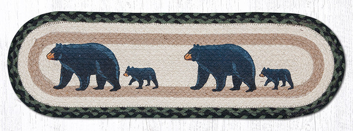 This Black Bear Table Runner and Trivet set features expertly hand-stenciled Mama and Baby Bear artwork by Jan Harless. Made from 100% natural jute, the set includes an 8 x 27" table runner and two 10" trivets in coordinating green, charcoal, and natural hues. Durable and crafted with attention to detail, it adds a refined rustic touch while protecting your surfaces with sustainable materials. Ideal for enhancing nature-inspired table settings with artistic quality.