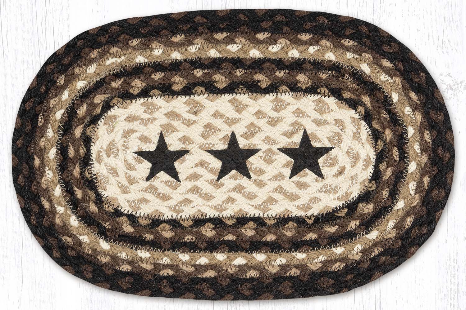 Expertly stenciled, this 10" x 15" oval swatch features a striking black star design. Made of 100% natural jute, it adds a touch of rustic elegance to any table setting. Practical and versatile, it can also be used as a small placemat. Colors are mocha and Frappuccino.