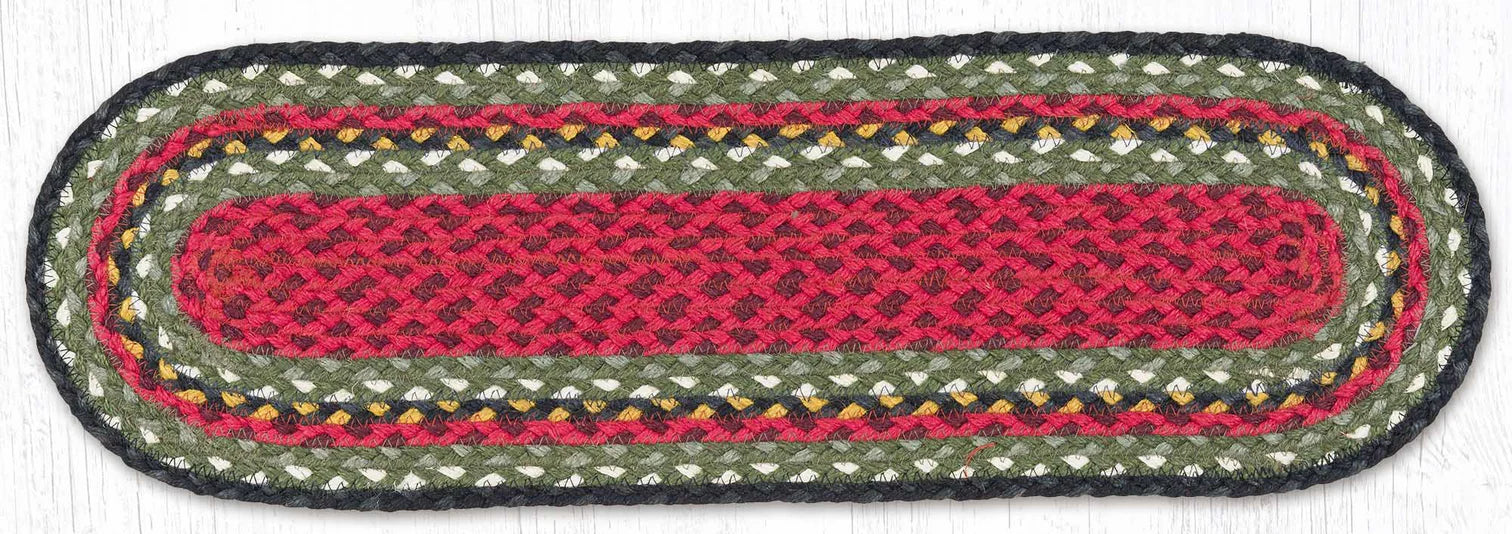 This 8.25" x 27" braided runner is made with 100% natural jute, providing extreme durability for use as a stair tread or small table runner. Its burgundy, olive, and charcoal color scheme adds warmth and elegance to any space.