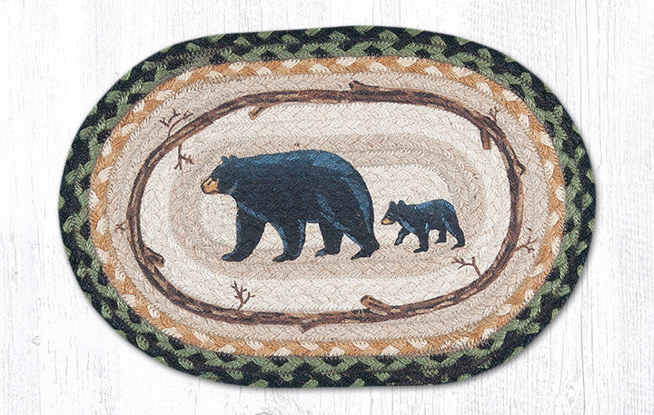 Enhance your dining experience with our Mama & Baby Bear Swatch. Made from 100% natural jute and featuring a hand-stenciled design by artist Jan Harless, this versatile 10"x15" oval can be used as a placemat, adding a touch of rustic charm to any meal. Available in black, sage, and natural colors.