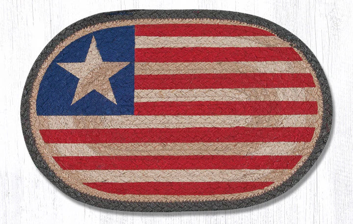 Enhance your table with our Hand Stenciled Oval Swatch featuring the original flag design. Measuring at 10"x15" and made of 100% natural jute, this placemat adds a patriotic touch to any dining experience in red, white, and blue. Durable and unique, a perfect fit for any table.